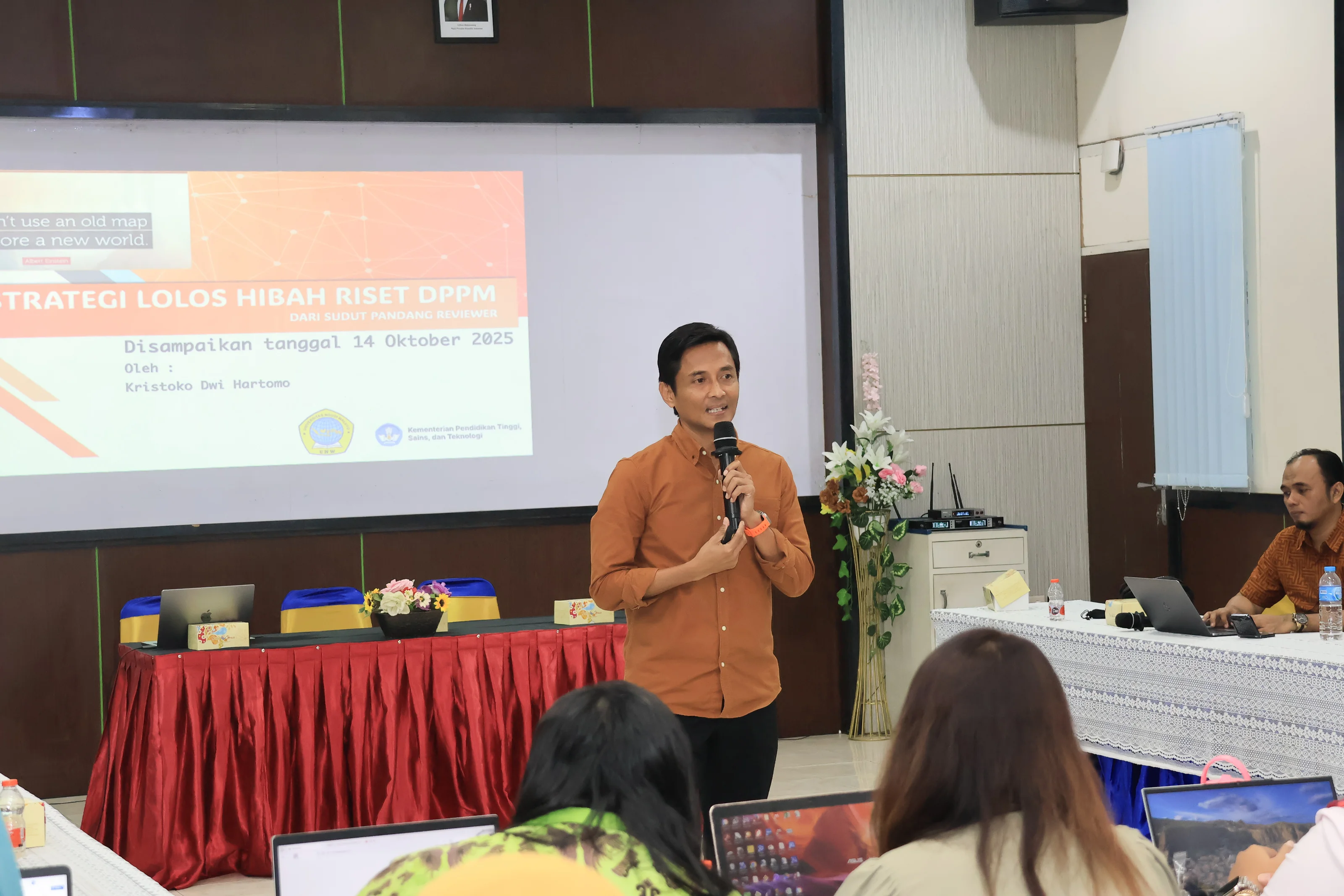 Kegiatan dilanjutkan dengan pemaparan materi oleh Prof. Dr. Kristoko Dwi Hartomo. M.Kom. Dalam penjelasannya beliau menyampaikan terkait strategi lolos hibah riset DPPM dari sudut pandang reviewer, skema penelitian DPPM 2026, strategi lolos seleksi administrasi dan substansi, best practice, hingga diskusi interaktif dengan peserta. Bimbingan klinik ini diharapkan dapat menjadi pijakan penting dalam memperkuat reputasi Universitas Ngudi Waluyo di kancah perguruan tinggi nasional, sekaligus meningkatkan capaian target universitas secara signifikan.